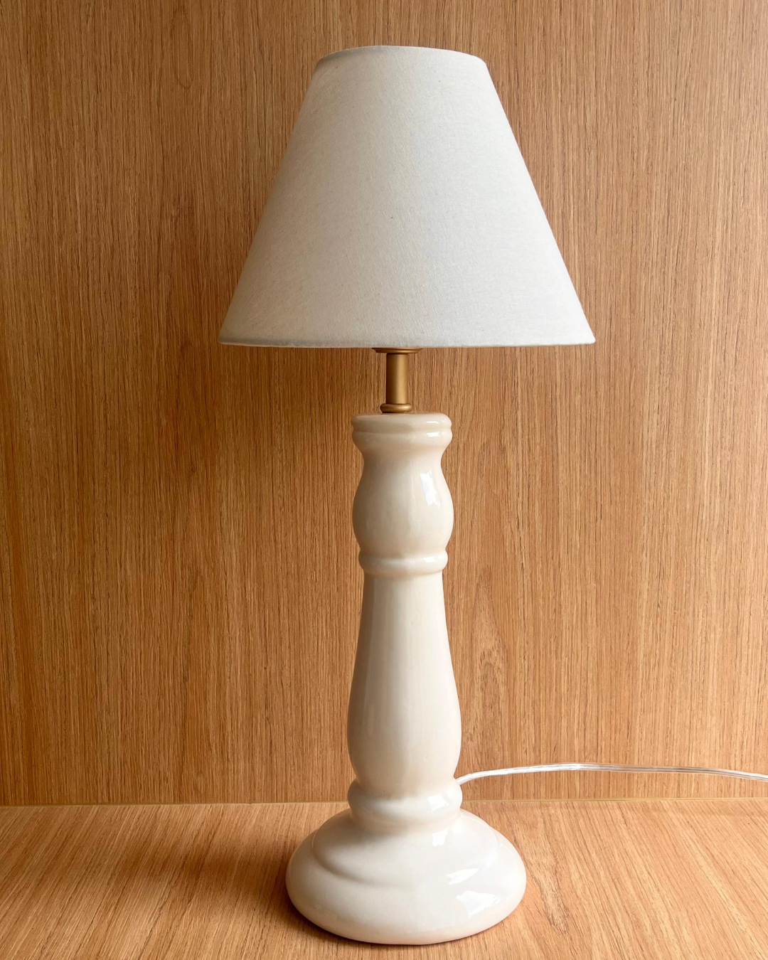 Abajur formato castiçal feita em cerâmica na cor off white, acompanha cúpula cônica off white.