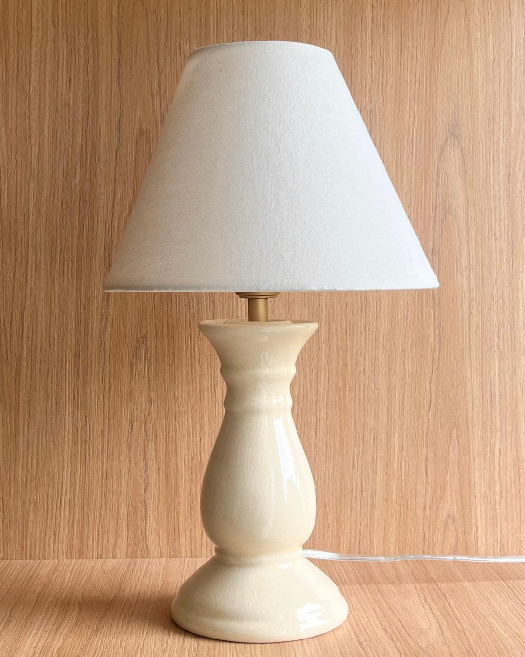Abajur formato castiçal feita em cerâmica na cor off white, acompanha cúpula cônica off white.