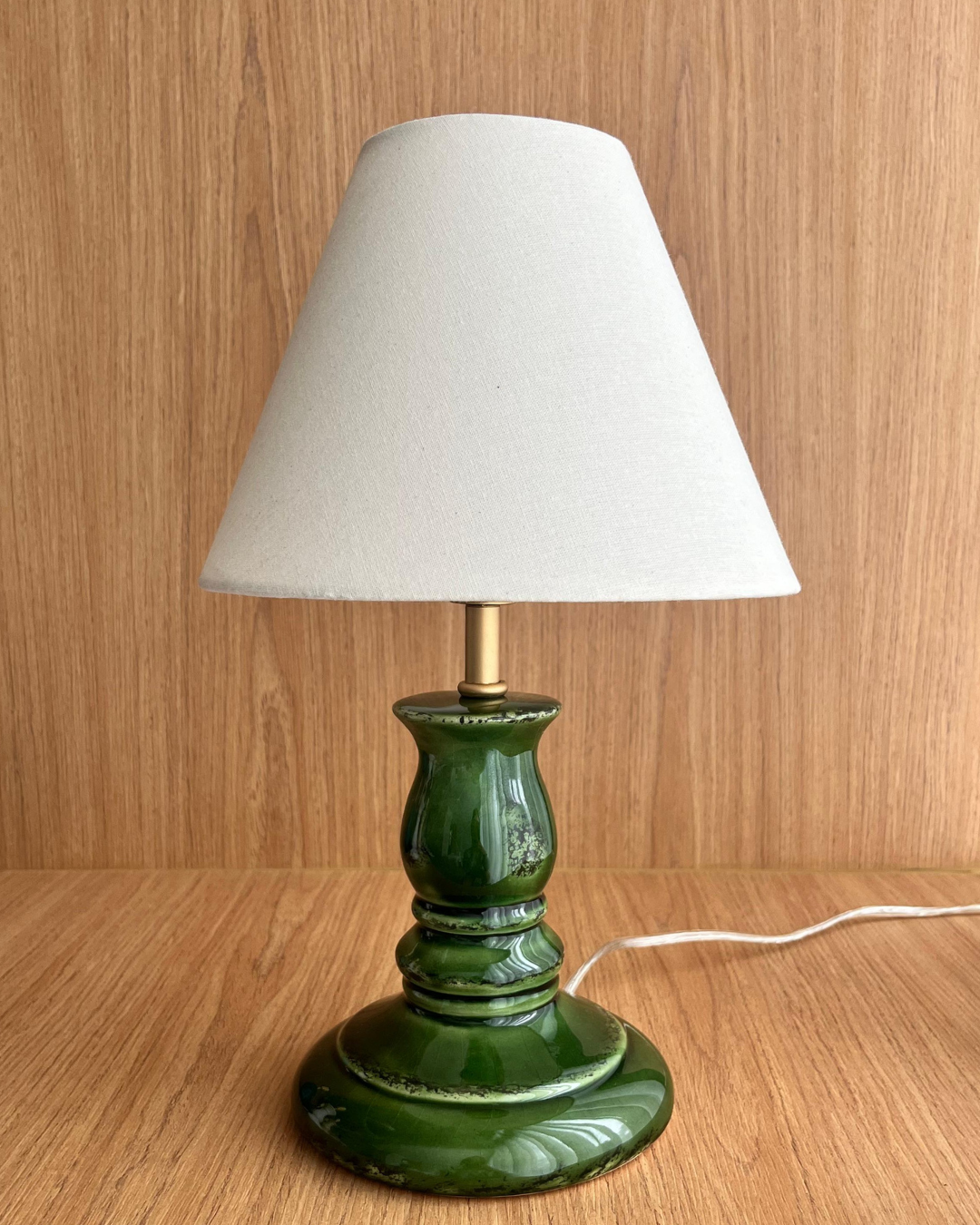Abajur formato castiçal feita em cerâmica na cor verde mesclado, acompanha cúpula cônica off white.