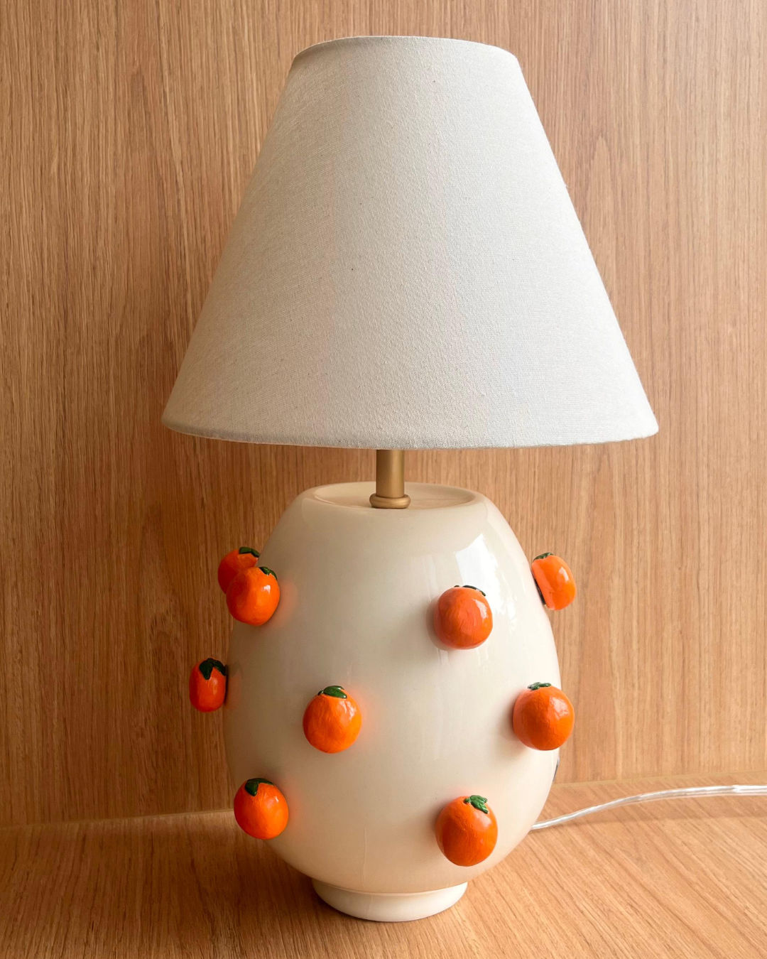 Abajur formato vaso feita em cerâmica na cor off white com aplicação de laranjas feitas em cerâmica à mão, acompanha cúpula cônica off white.