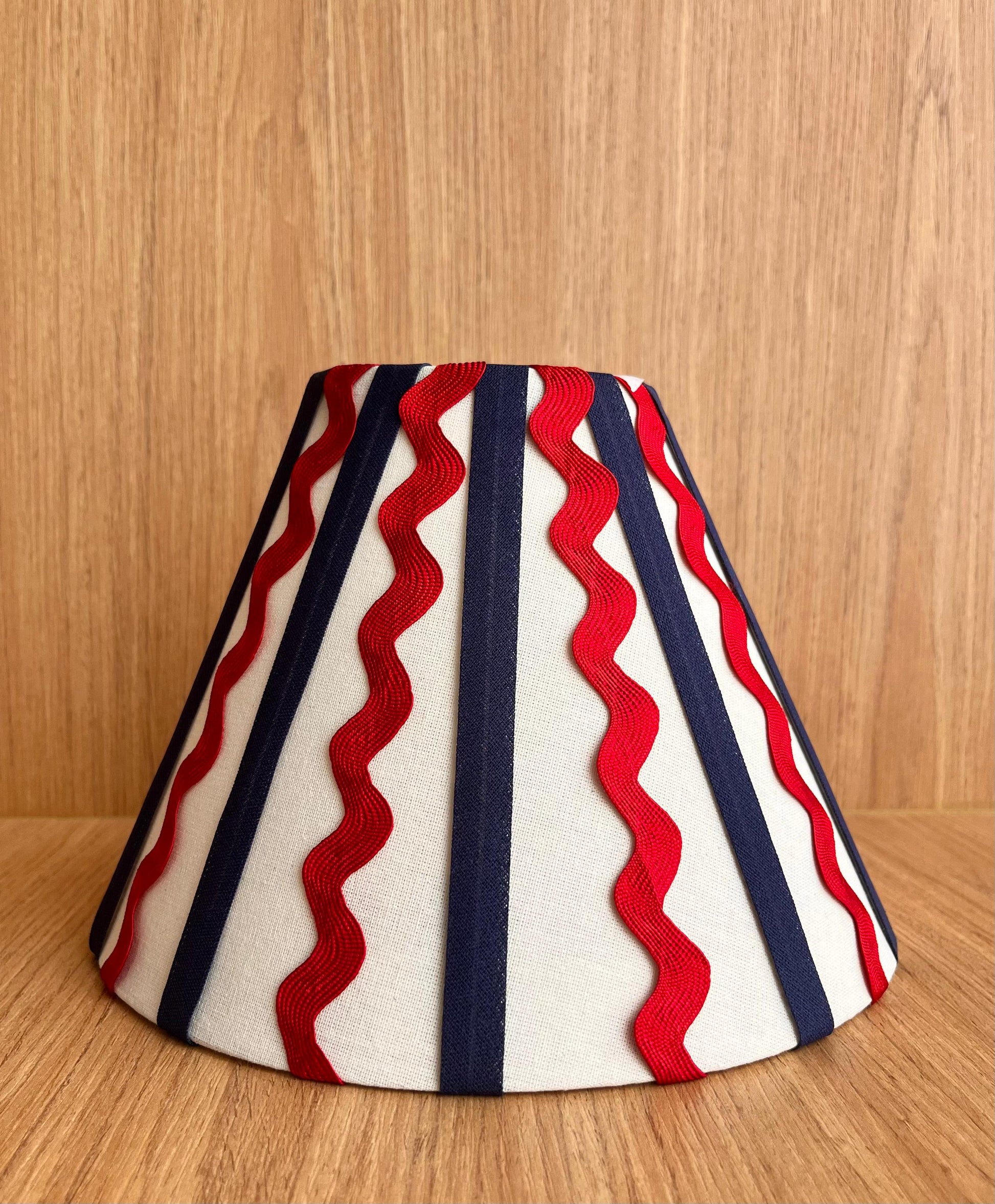 Cúpula cônica com detalhes em aviamentos azul e vermelho - para alterações de cores, tamanhos e encomendas especiais, contatar via WhatsApp.